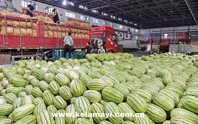 本報記者 戴旭虎 攝 7月28日,在九鼎農(nóng)產(chǎn)品批發(fā)市場,工人正在卸從奎屯運來的瓜。