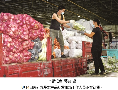 本報訊(記者 戴旭虎)8月5日23時,我市九鼎農產品批發(fā)市場內,蔬菜、水果交易區(qū)剛卸下車的土豆、蓮花白、茄子、芹菜、花菜、西紅柿、甜瓜、香蕉等新鮮蔬果堆積成垛。