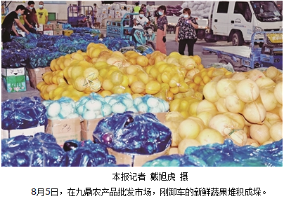 “商戶們積極備貨,品種涵蓋日常所需各類蔬果。目前,九鼎農產品批發(fā)市場的日進貨量充足、蔬果價格平穩(wěn),完全能夠滿足市場需求。”我市九鼎農產品批發(fā)市場負責人馬曉鑫說。