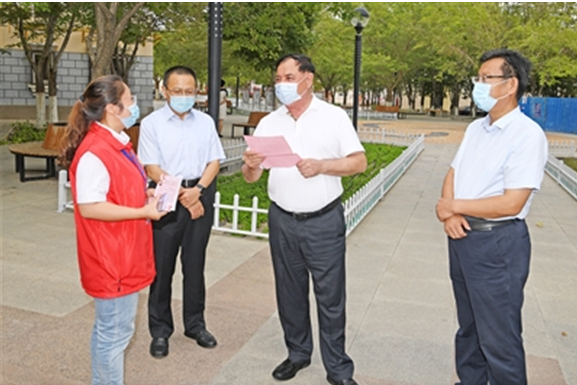8月18日,在白堿灘區(qū)(克拉瑪依高新區(qū))沁苑社區(qū),自治區(qū)人大常委會黨組書記、主任肖開提·依明(右二)帶領(lǐng)自治區(qū)督導組一行,在市委書記趙文泉(右一)等市領(lǐng)導的陪同下,對我市疫情防控工作進行了檢查指導。本報首席記者 閔勇 攝