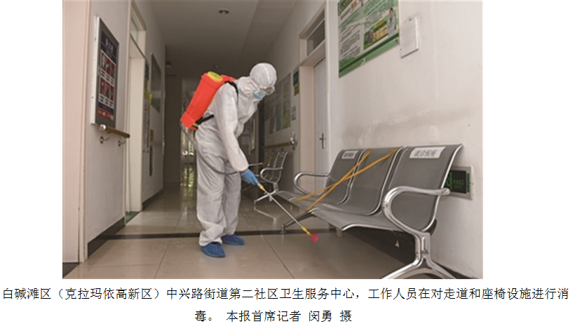 8月21日上午,白堿灘區(qū)(克拉瑪依高新區(qū))中興路街道第二社區(qū)衛(wèi)生服務(wù)中心,身著防護服的工作人員,背著消毒液罐對樓內(nèi)外重點區(qū)域進行噴霧消毒,用抹布和醫(yī)用消毒巾擦拭座椅、診斷操作臺面。