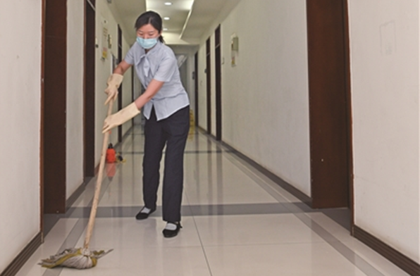 8月22日下午,在克拉瑪依區(qū)政府辦公樓,西部綠洲公司的保潔員正在樓內(nèi)作業(yè)。本報(bào)首席記者 閔勇 攝?