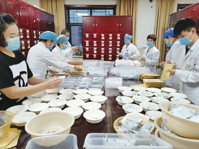 市人民醫(yī)院(中醫(yī)醫(yī)院)醫(yī)護(hù)人員加班加點(diǎn)分裝中藥配方顆粒。