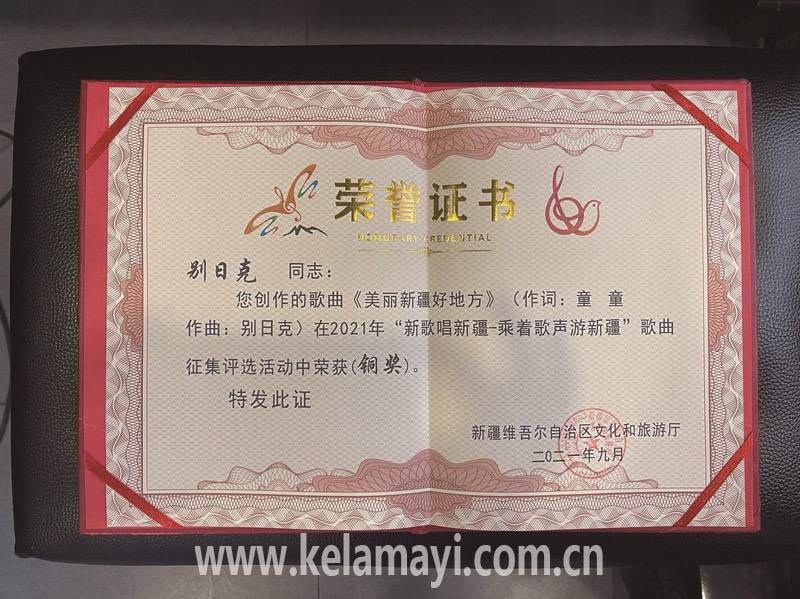 ????這個榮譽證書是2021年新疆維吾爾自治區(qū)文化和旅游廳舉辦的建黨100周年文旅節(jié)目“乘著歌聲游新疆”系列歌曲比賽中,別日克·斯達(dá)克選送的原創(chuàng)作品《美麗新疆好地方》榮獲了三等獎的證書。