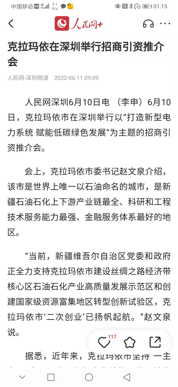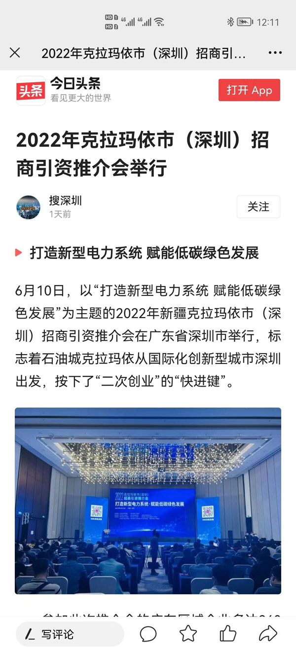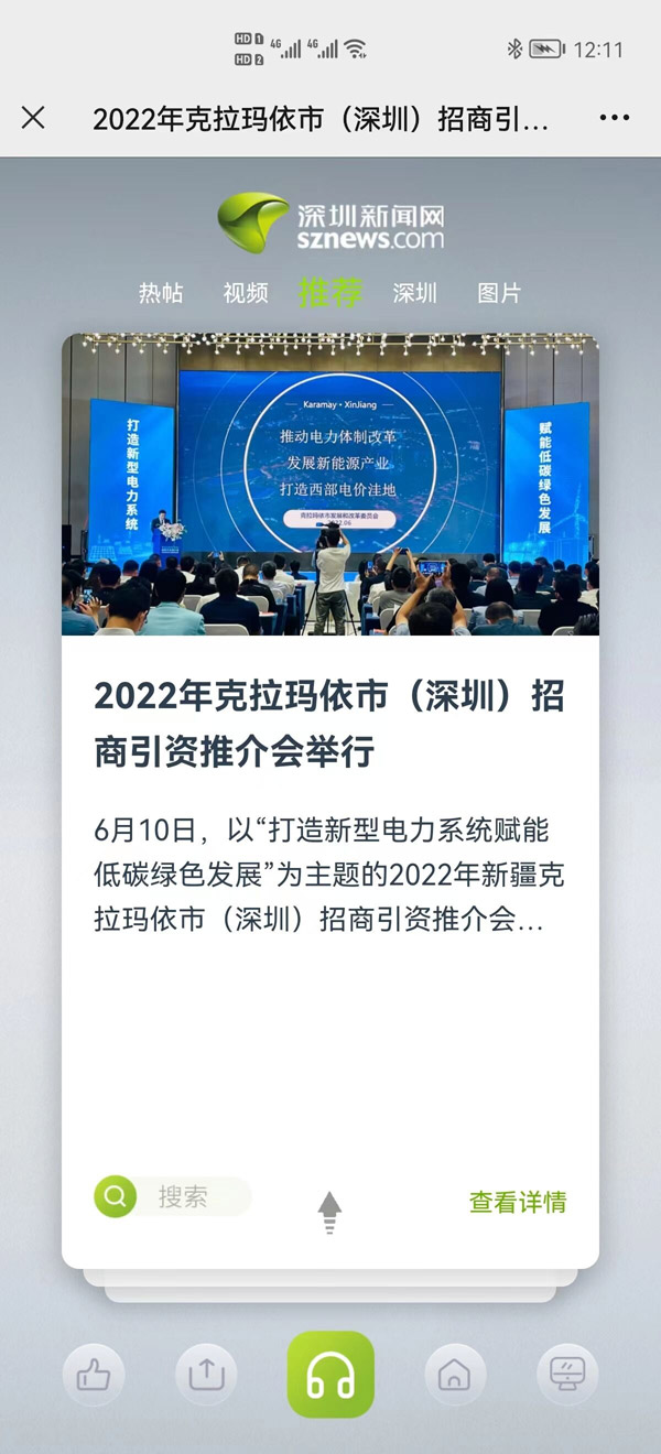 ????《2022年新疆克拉瑪依市(深圳)招商引資推介會(huì)舉行新電力系統(tǒng)賦能綠色發(fā)展》《2022年新疆克拉瑪依市(深圳)招商引資推介會(huì)舉行》《“石油城”克拉瑪依招商引資推介會(huì)在深圳舉行》......中國(guó)能源新聞網(wǎng)、深圳新聞網(wǎng)、南方網(wǎng)等多家媒體聚焦2022年新疆克拉瑪依市(深圳)招商引資推介會(huì),從多角度進(jìn)行了報(bào)道。
