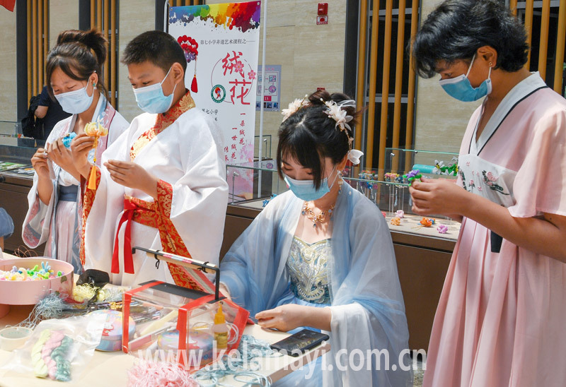 6月11日,我市2022年“文化和自然遺產(chǎn)日暨第十屆新疆非物質(zhì)文化遺產(chǎn)周”活動現(xiàn)場,手工愛好者身著古裝制作絨花。 本報(bào)全媒體首席記者閔勇 攝