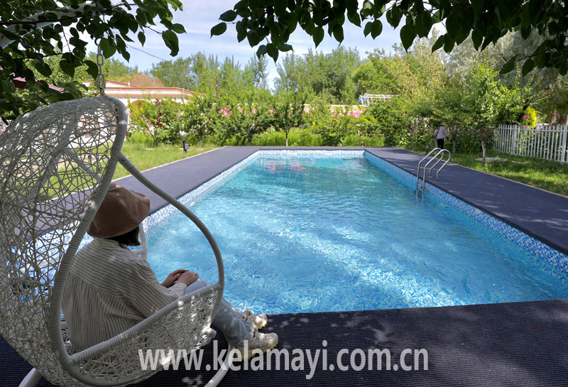 本版未署名圖片由本報(bào)全媒體記者 崔文娟 攝在藍(lán)天、綠樹的襯映下,小拐鄉(xiāng)民宿中的游泳池碧波蕩漾、令人神往。