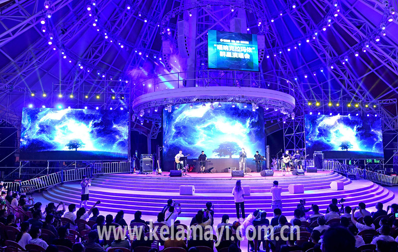 ????夜幕漸漸降臨,現(xiàn)場(chǎng)氣氛不斷升溫。歌手們現(xiàn)場(chǎng)演繹了《晚安克拉瑪依》《這里是新疆》《我愛你克拉瑪依》《同桌的你》《可可托海的牧羊人》等原創(chuàng)經(jīng)典歌曲。