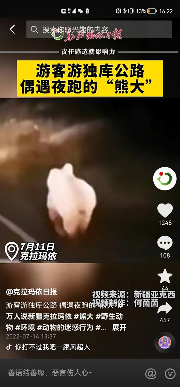????7月14日,克拉瑪依日報官方抖音號發(fā)布視頻《游客游獨庫公路偶遇夜跑的“熊大”》,該作品引發(fā)網友關注,截至昨日12時,視頻播放量已達61.6萬人次,獲贊2347個,并吸引1127人次轉發(fā)。