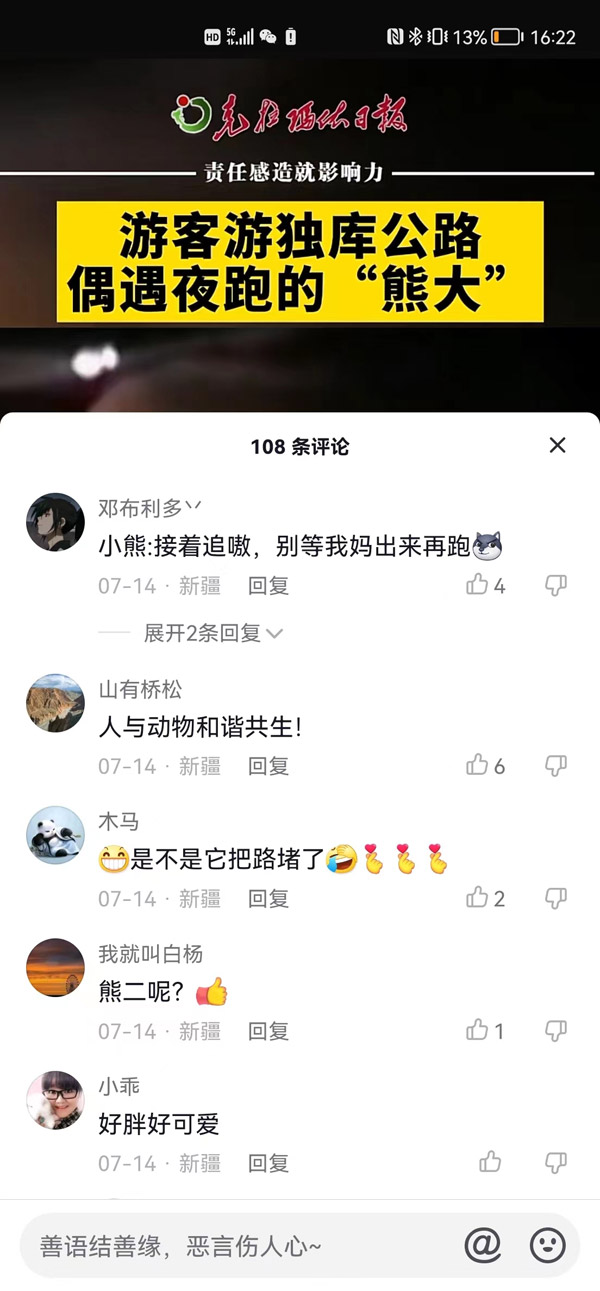 ????“獨庫公路居然還能看到熊,太神奇了!它跑步的樣子真的讓我想起了動畫片《熊出沒》里的熊大,太可愛了!我之前在獨庫公路自駕游的時候也見到過一些野生動物,我們一定要好好保護它們,只有生物種群擴大了,我們人類的生存環(huán)境才會更好!”網友“你笑起來真好看”說。
