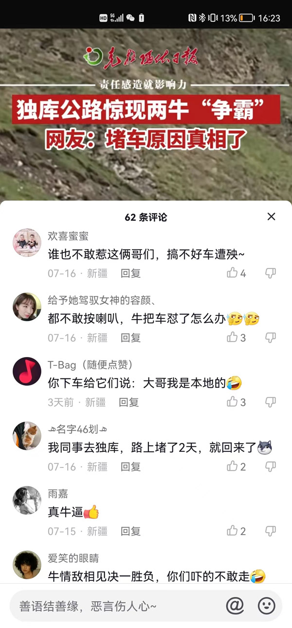 ????“當天我們一家人自駕游準備去伊犁那拉提玩兒的,在獨庫公路遇到了這兩頭牛在打架,打得還特激烈,感覺在決斗似的,當時覺得這個場面特別有趣,堵車了也覺得不算啥了,算是這次出行的一件趣事兒吧。”游客張先生說。