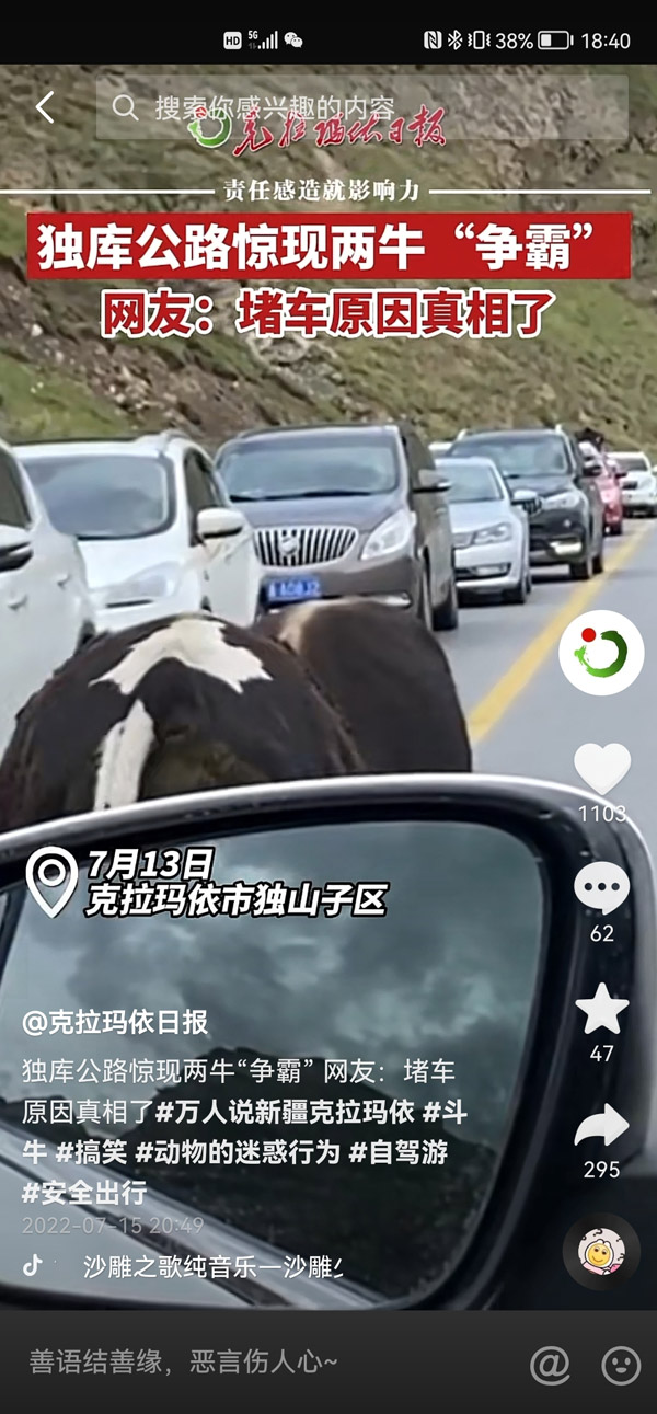 ????“哈哈,這也太有意思了。這兩頭牛是在獨庫公路上走著走著打起來了嗎?司機們也不下車勸勸架去,堵了這么多車,它倆的決斗也算是有觀眾了。這可能就是傳說中的‘你永遠不知道堵車的真正源頭是什么’!”網友“黑夜中的螢火蟲”說。