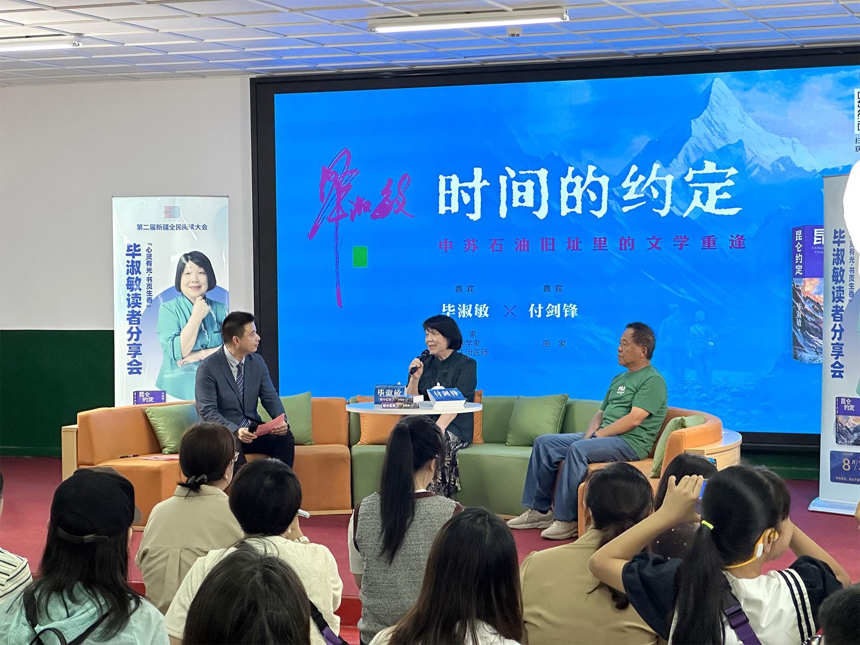 8月30日,著名作家畢淑敏攜最新長(zhǎng)篇小說(shuō)《昆侖約定》走進(jìn)克拉瑪依市獨(dú)山子區(qū),舉辦作品座談分享及簽售活動(dòng)。該書(shū)封面插圖作者、我市畫(huà)家付劍鋒一同參加簽售活動(dòng)。克拉瑪依融媒記者 胡雪婷 攝