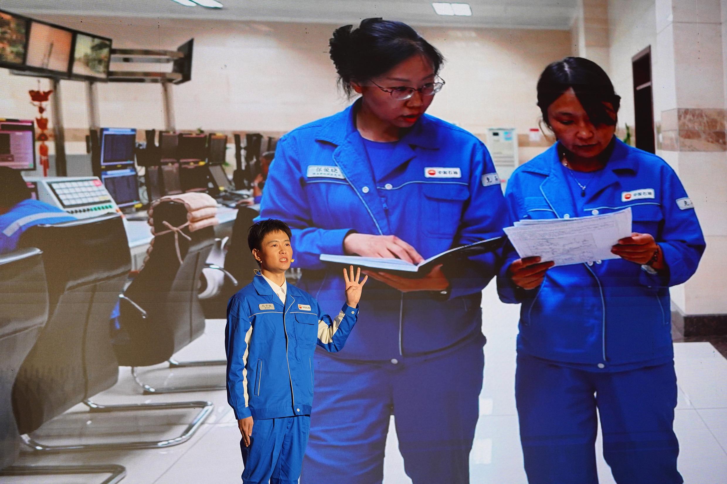 克石化煉油四部員工屈治華作題為《刻在戈壁煉塔上的擔當》的宣講。