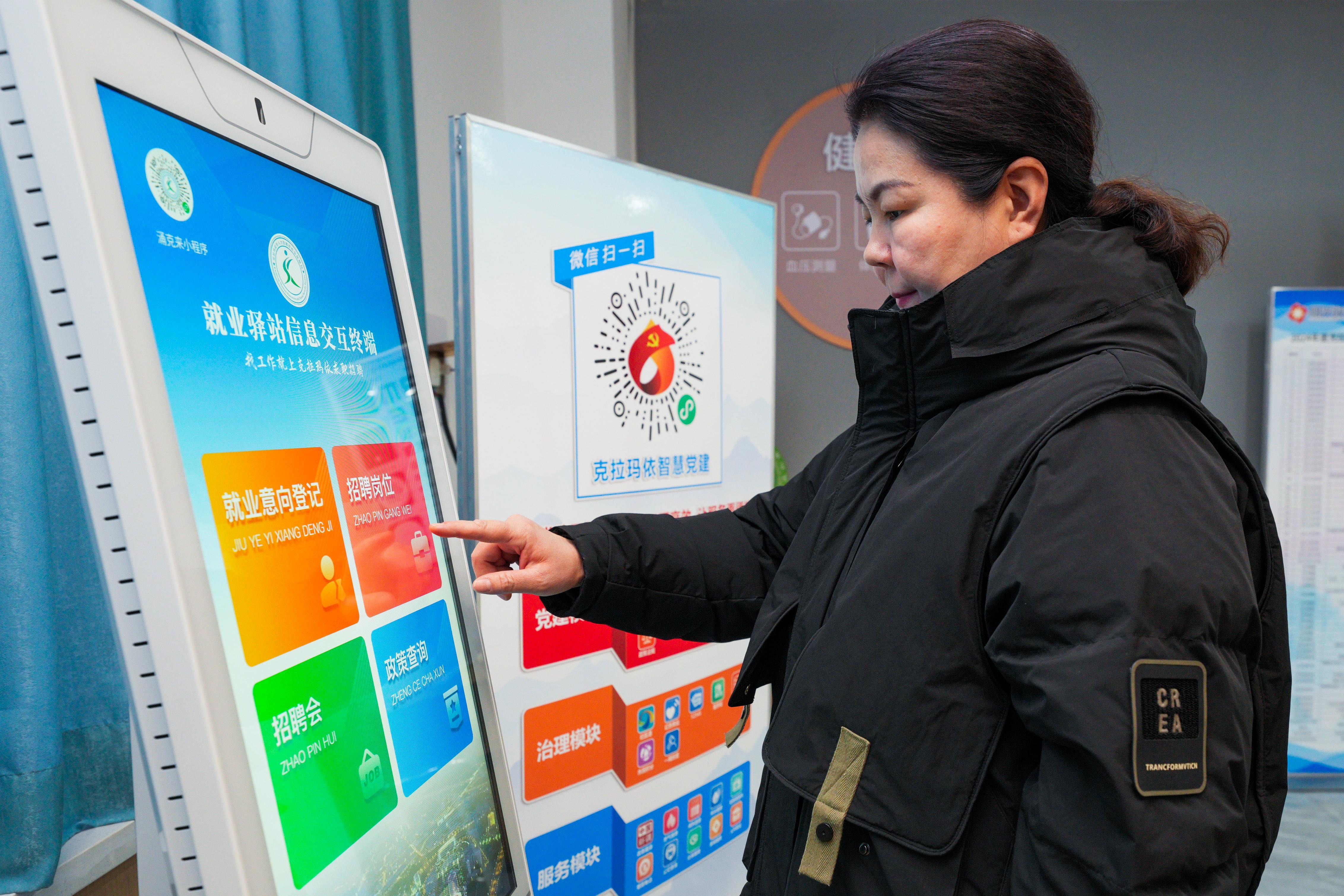 1月21日,克拉瑪依區(qū)昆侖路街道南苑社區(qū)居民通過居委會大廳的信息交互終端大屏了解相關(guān)政策信息??死斠廊诿接浾?閔勇 攝