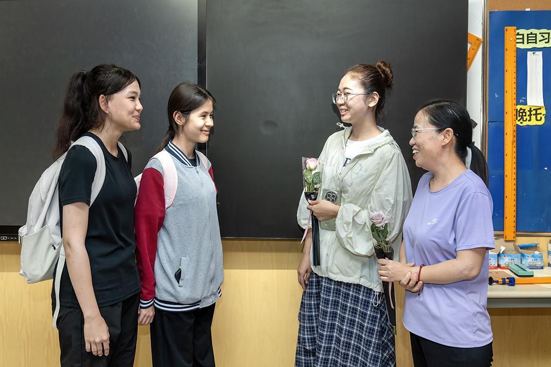 9月10日,北師大克拉瑪依附屬學校2025級高一新生阿依孜巴·阿迪力(左一)和同學回到母校市第一中學初中部探望老師,并送上節(jié)日祝福。克拉瑪依融媒記者 閔勇 攝