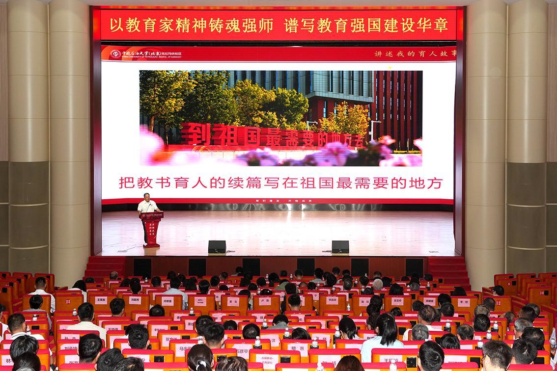 9月10日,中國石油大學(北京)克拉瑪依校區(qū)舉辦2025年教師節(jié)慶祝大會,來自華東理工大學的支教銀齡教師王榮發(fā)作教育家精神主題分享??死斠廊诿接浾?崔文娟 攝