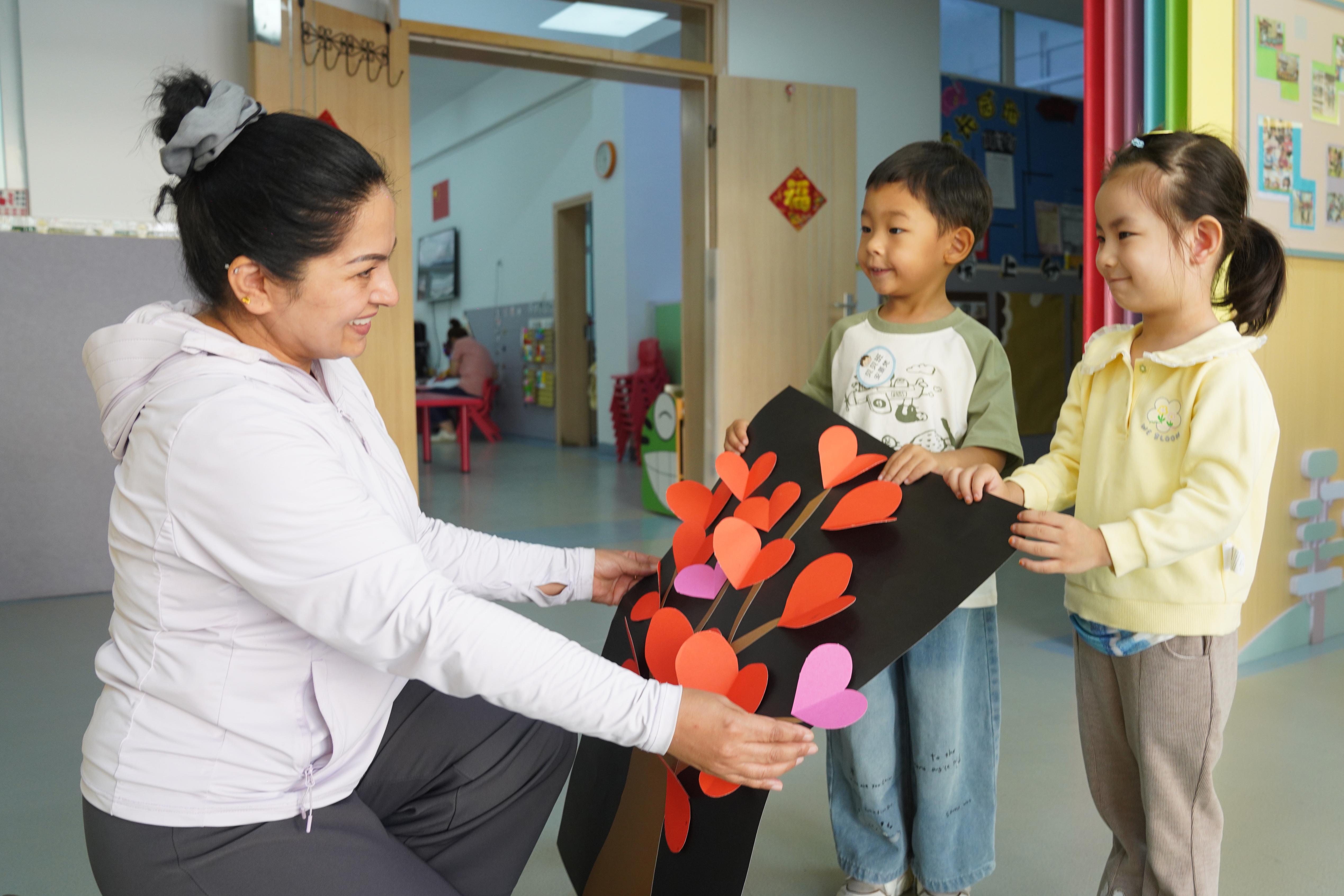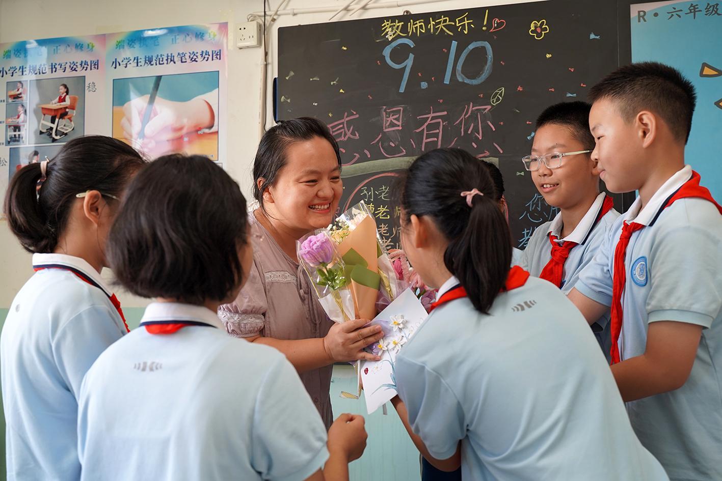9月10日,克拉瑪依區(qū)紅旗幼兒園的孩子將自制禮物獻給老師??死斠廊诿接浾?非爾代維斯·熱夏提攝