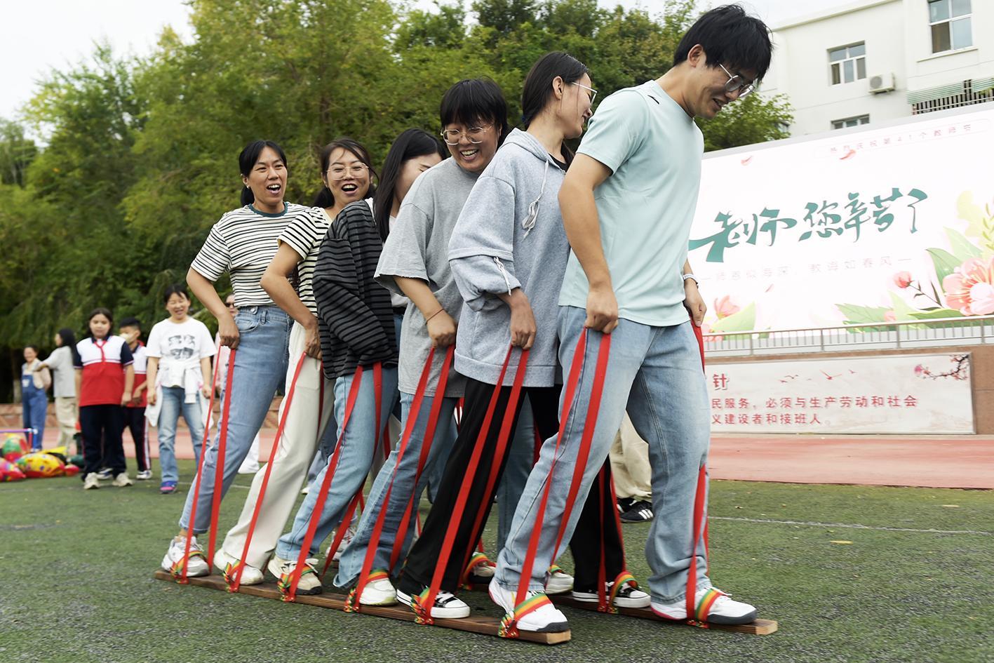 9月10日,市第三小學舉辦慶祝教師節(jié)活動,老師在趣味運動場上玩得不亦樂乎??死斠廊诿接浾?關祥榮 攝
