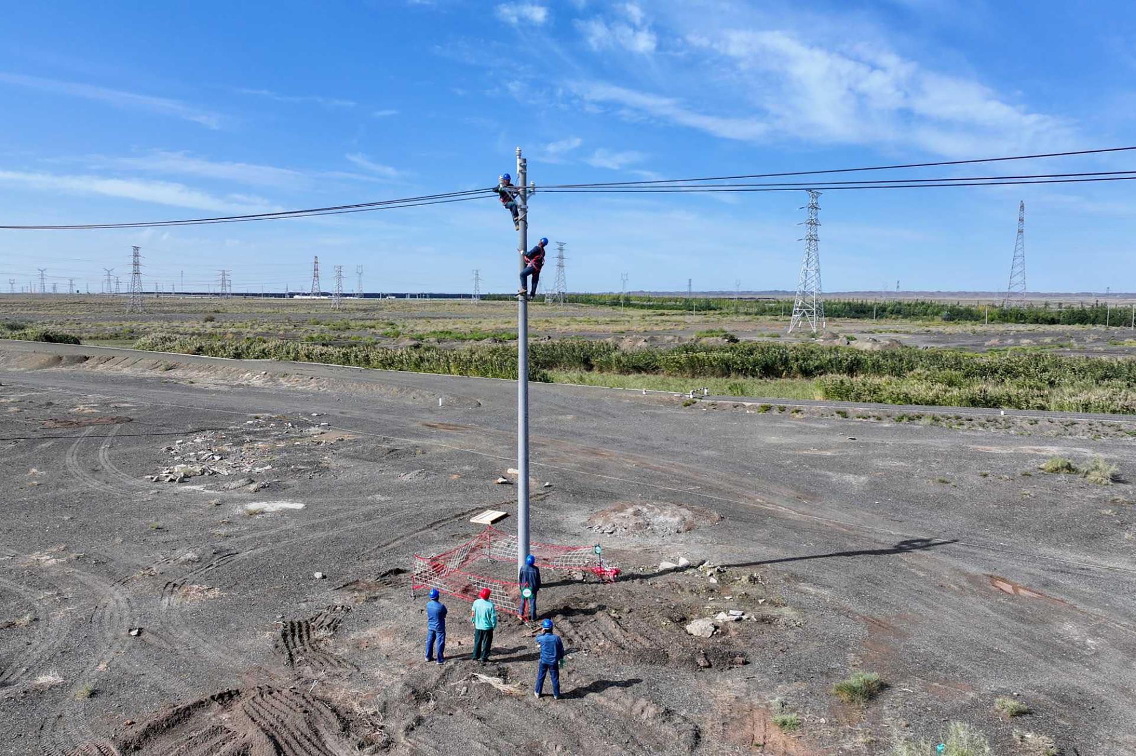 工作人員正在對展放的導線進行綁扎固定。圖片由國網克拉瑪依供電有限公司提供