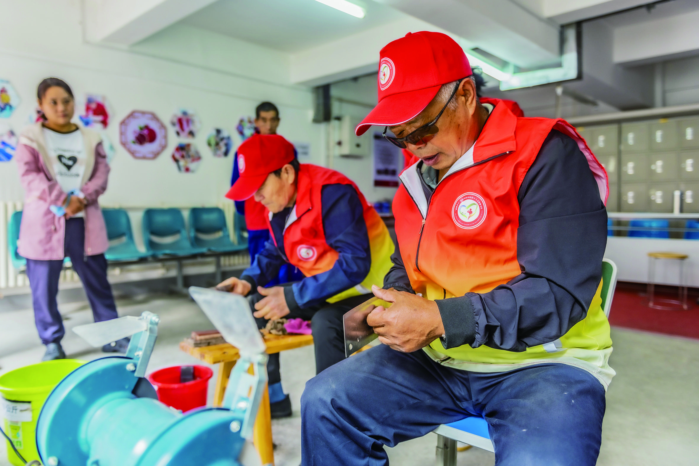 9月14日,新樂志愿服務(wù)隊隊員給居民磨菜刀。當(dāng)天,克拉瑪依區(qū)祥和苑社區(qū)舉辦“紅色星期日”便民服務(wù)活動,為居民提供磨菜刀、中醫(yī)把脈、法律咨詢等服務(wù)。