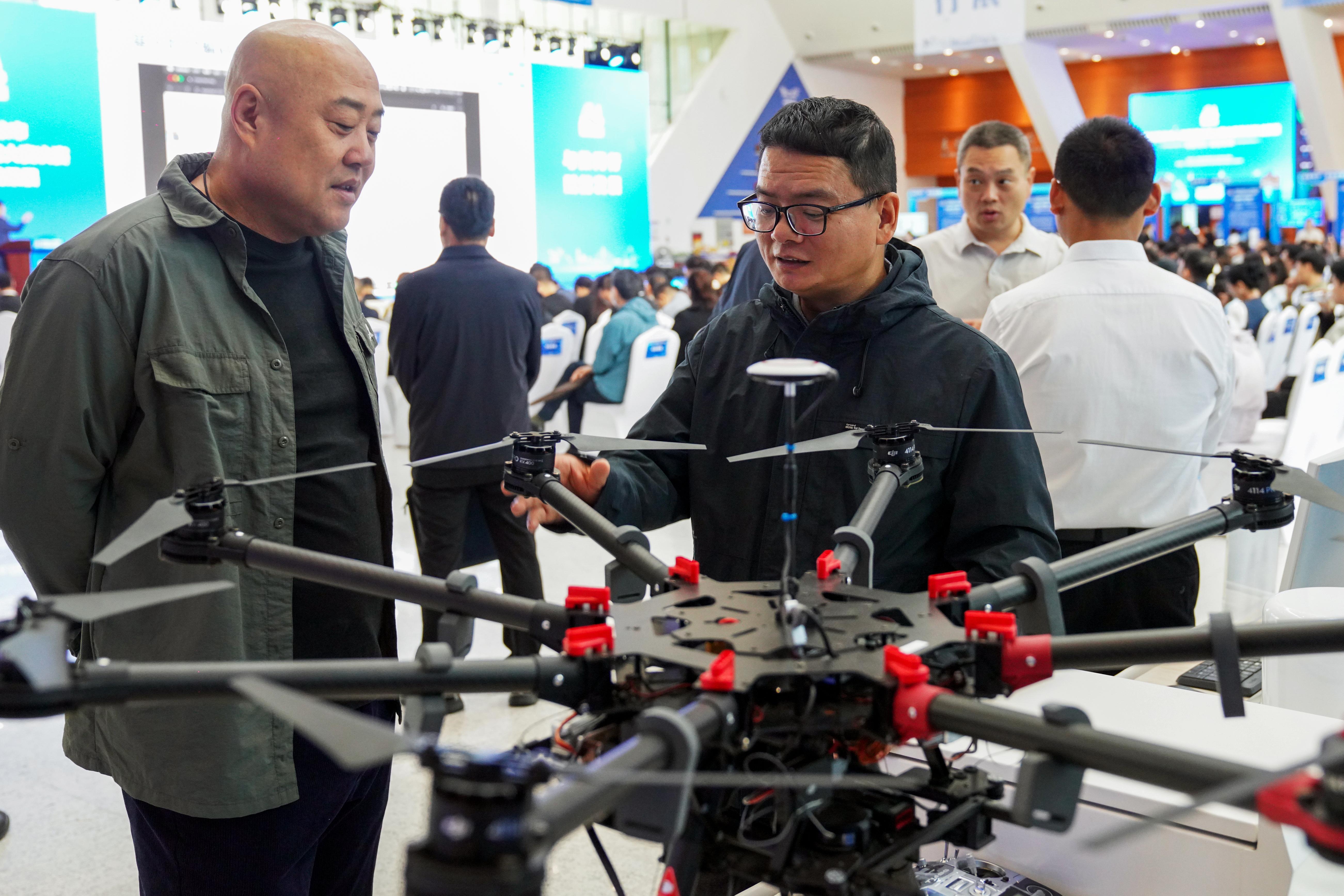 克拉瑪依市氣象局工作人員(右)正在演示“AI智報(bào)天氣”項(xiàng)目的無(wú)人機(jī)等部件。克拉瑪依融媒記者 非爾代維斯·熱夏提 攝