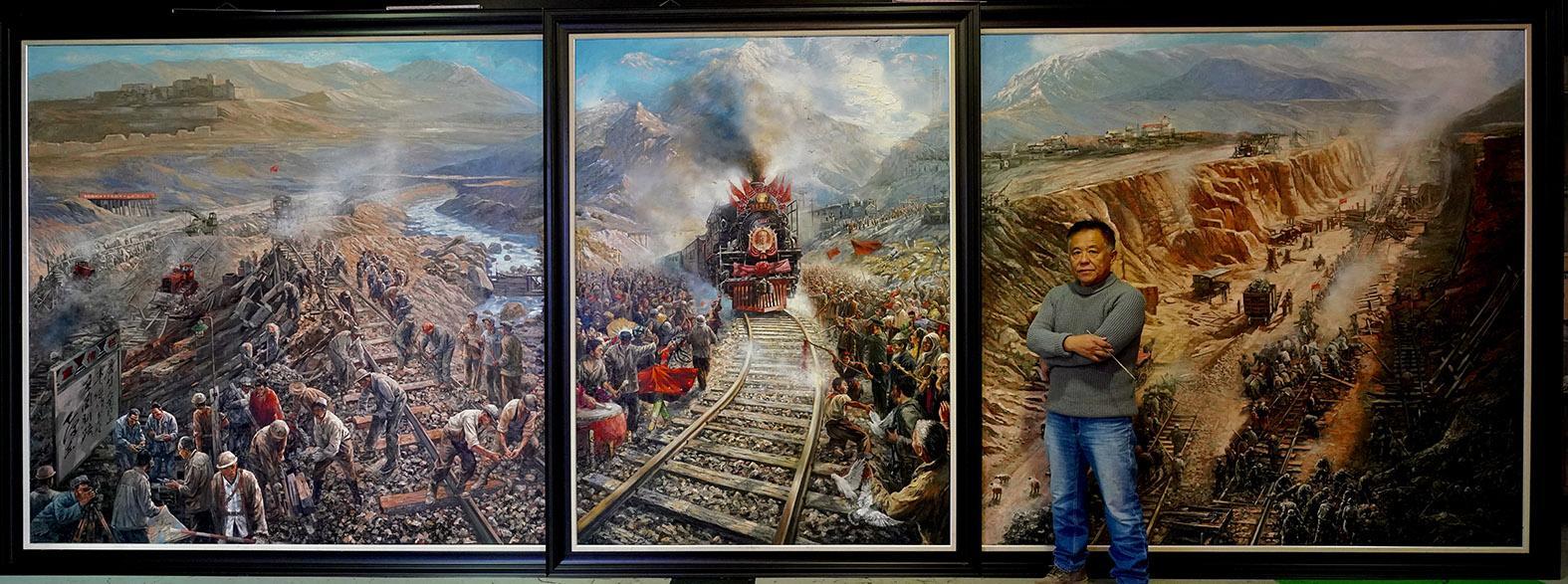 “1952年,為了改變西部,改變新疆沒有鐵路的歷史,黨中央下令修筑蘭新鐵路。如今,四通八達的交通帶給新疆巨大的變化,老百姓擁有了便利的出行條件。工業(yè)題材作品創(chuàng)作是我的立身之本,我在創(chuàng)作這幅作品時也很感慨、很自豪。”付劍鋒說。