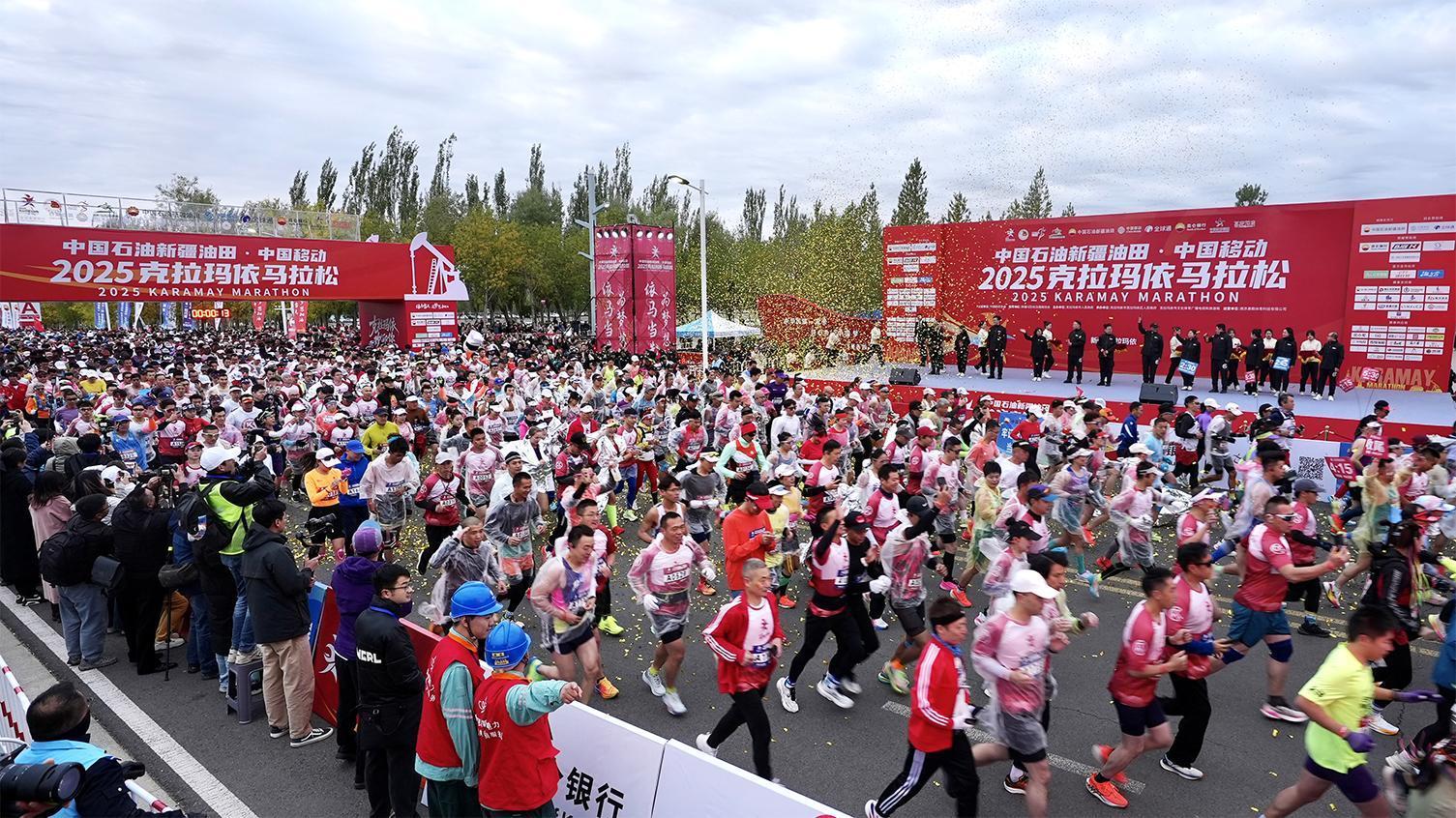 2025年10月6日,中國石油新疆油田·中國移動(dòng)2025克拉瑪依馬拉松在市體育館東廣場(chǎng)鳴槍開跑,1.5萬名選手參賽。圖片均由克拉瑪依融媒記者 崔文娟 攝