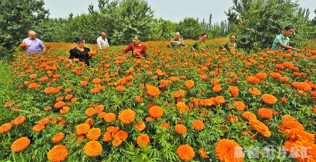 “萬壽菊是‘脫貧花’,是促進(jìn)我縣調(diào)整農(nóng)業(yè)產(chǎn)業(yè)結(jié)構(gòu)、打贏脫貧攻堅(jiān)戰(zhàn)的重要突破口和經(jīng)濟(jì)發(fā)展的新引擎?!鄙嚳h副縣長樊海濤說。