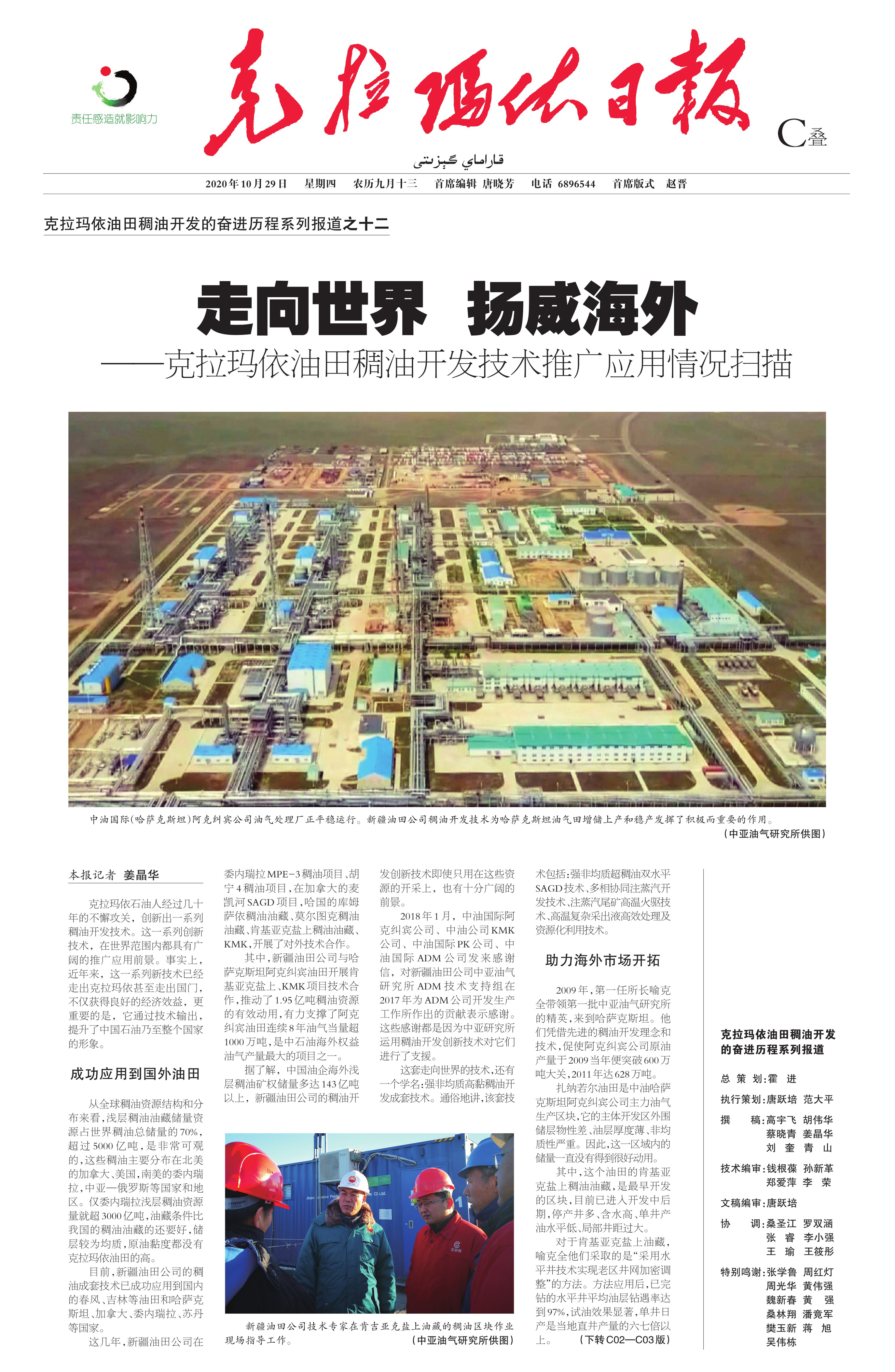 從2009年的先行摸索和技術支持,到如今的技術升級和逐步推廣,由勘探開發(fā)研究院中亞油氣研究所牽頭的新疆油田公司海外技術中心,已憑借克拉瑪依石油人幾十年創(chuàng)新研發(fā)的稠油開發(fā)技術,在哈薩克斯坦的稠油開發(fā)上取得了驕人的業(yè)績。