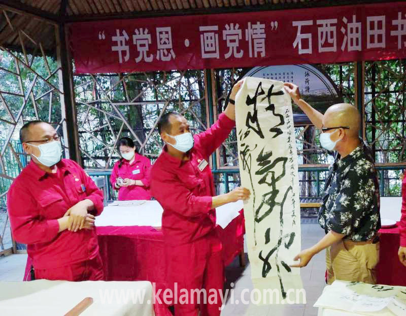 ????交流期間,克拉瑪依著名書畫家李伯霖、李喜生和劉大彥現(xiàn)場揮毫,為石西員工創(chuàng)作30余幅書畫作品。