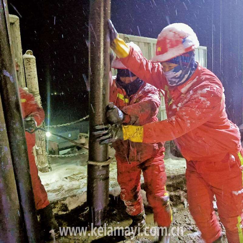 西部鉆探準(zhǔn)東鉆井公司石油工人冒著風(fēng)雪在呼6井鉆井施工現(xiàn)場提下鉆施工。本報通訊員 周建玲 攝