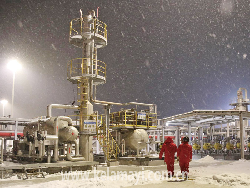 呼圖壁儲氣庫員工在夜間冒著大雪巡檢設(shè)備運行情況。 本報通訊員 薛梅 攝