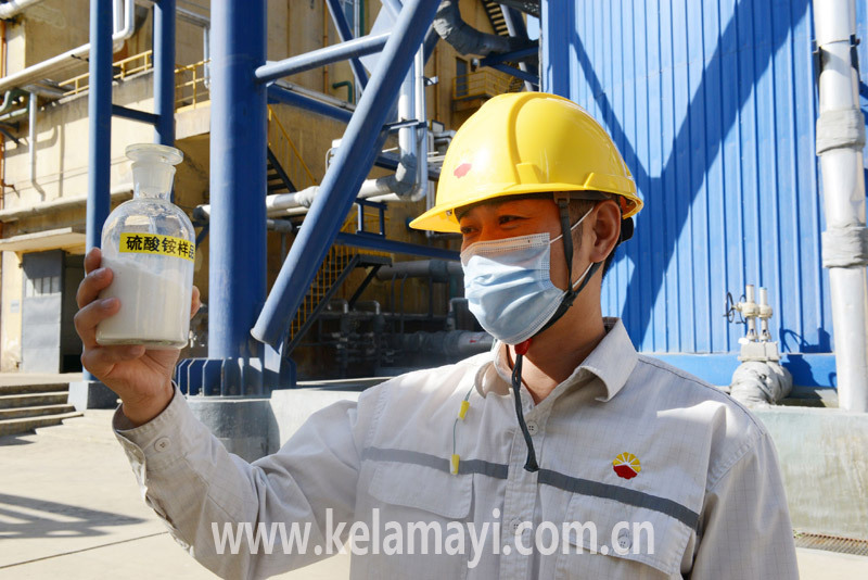 克石化員工拿著由煙氣脫硫裝置生產(chǎn)的硫酸銨產(chǎn)品。