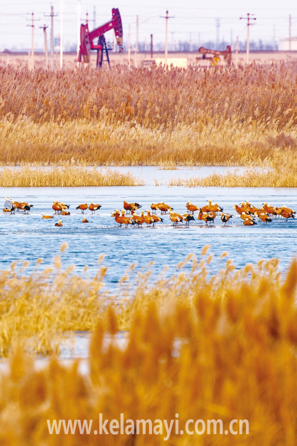 2021年12月7日, 遷徙途經(jīng)采油一廠五一區(qū)的候鳥聚集在井區(qū)西側一片濕地,這里是候鳥的樂園。本報全媒體首席記者 閔勇 攝