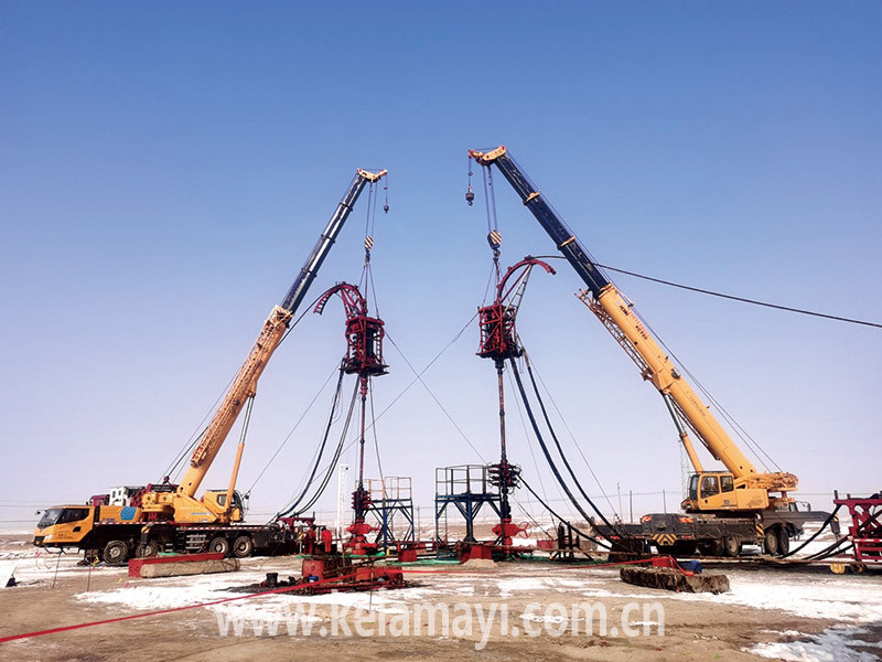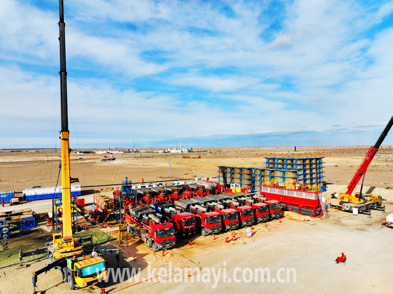 新疆油田瑪湖區(qū)域首口水平井MaHW6313、6314 雙井平臺大規(guī)模儲層改造壓裂現(xiàn)場。本報(bào)通訊員張平 攝