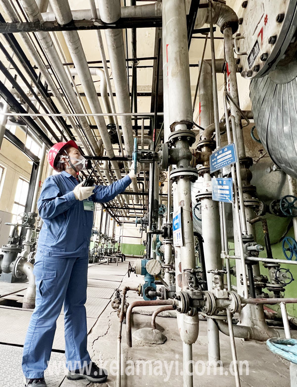 本報(bào)通訊員 金玲 攝 克石化員工正在檢查調(diào)整停工吹掃流程。