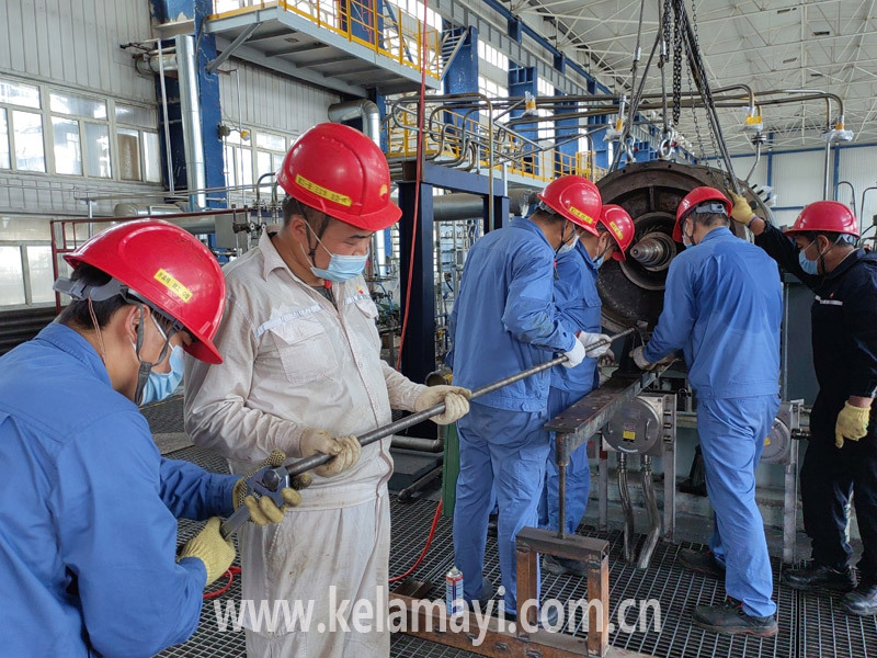 離心式壓縮機轉(zhuǎn)子回裝現(xiàn)場,克石化員工們同心協(xié)力展開作業(yè)。本報通訊員 丁恬甜 攝