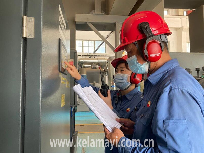 6月14日,克石化動力廠供風裝置開工驗收現(xiàn)場,員工正在認真檢查參數(shù)。本報通訊員 王琴 攝