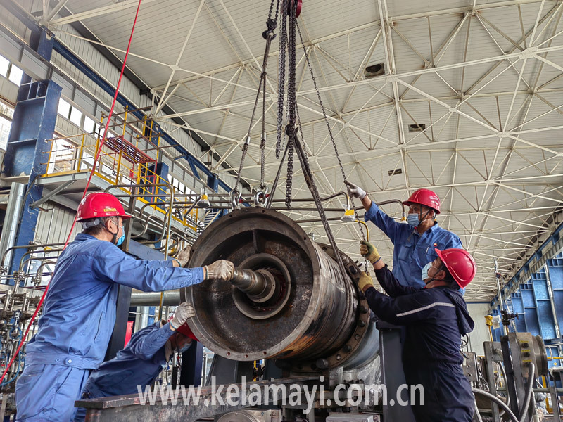 六月十三日,克石化員工正在回裝離心式壓縮機轉(zhuǎn)子。本報通訊員 丁恬甜 攝