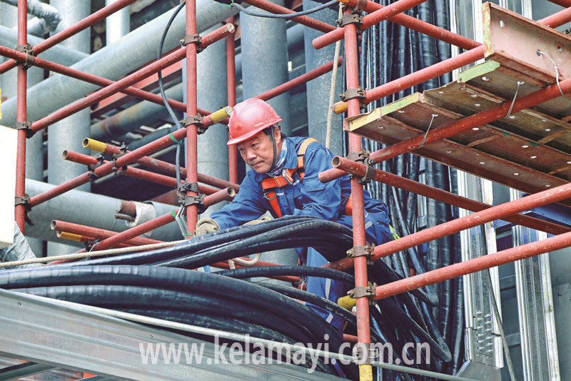 施工人員正在梳理電纜線。本報(bào)通訊員 佘新恩 攝
