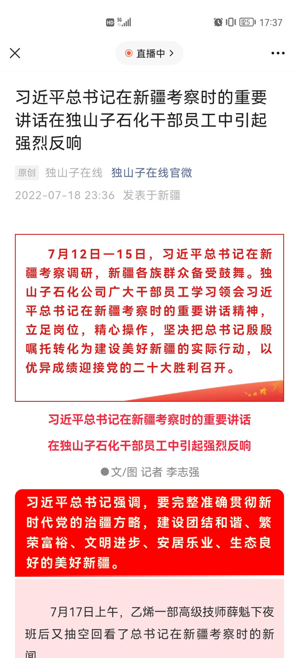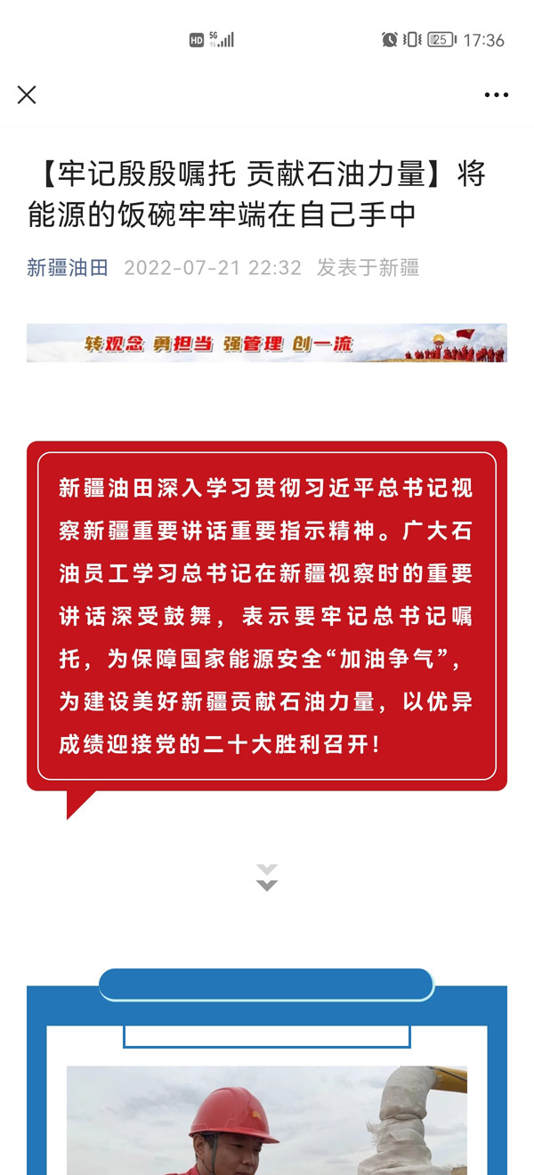 ????連日來,習(xí)近平總書記視察新疆重要講話重要指示精神在新疆油田公司、獨山子石化公司、克拉瑪依石化公司、西部鉆探工程有限公司等我市石油企業(yè)員工中引發(fā)熱烈反響。廣大石油員工深受鼓舞,紛紛表示要牢記習(xí)近平總書記的囑托,立足崗位,為保障國家能源安全“加油爭氣”,為建設(shè)美好新疆貢獻石油力量,以優(yōu)異的成績迎接黨的二十大勝利召開。