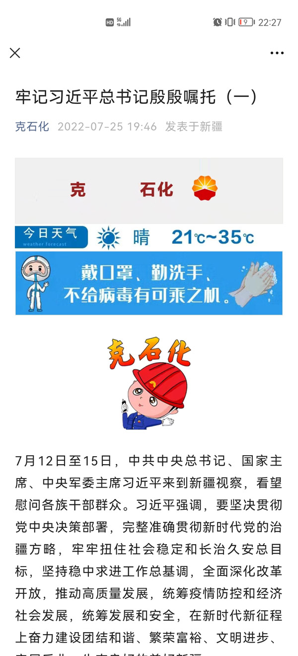 ????@煉油第三聯(lián)合車間員工呂偉娟:習(xí)近平總書記在新疆視察時指出:“新疆各民族都是中華民族大家庭不可分割的成員,56個民族擰成一股繩,保持定力、腳踏實地、同心協(xié)力、踔厲奮發(fā),我們要像石榴籽一樣,緊緊的抱在一起。”作為新時代央企員工,我要以強烈的政治意識、有力的工作舉措,為克石化發(fā)展貢獻智慧力量,為新疆發(fā)展做出應(yīng)有的貢獻,以優(yōu)異成績迎接黨的二十大勝利召開。