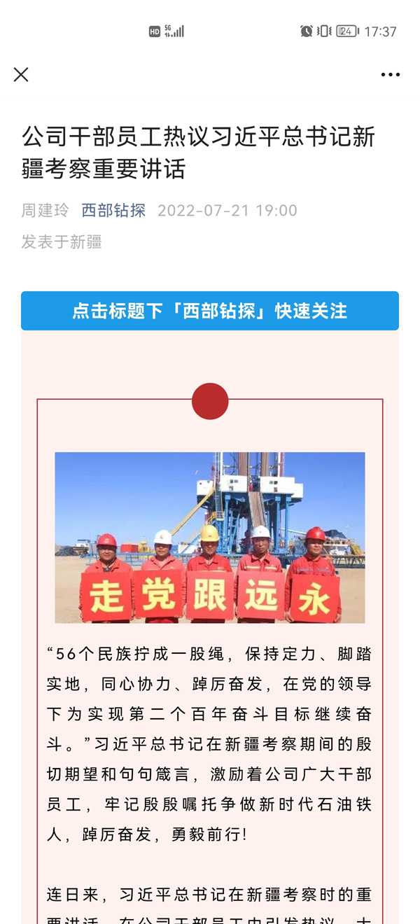 ????@準(zhǔn)東鉆井公司XD90101隊工程師王首都說:兩年前的7月,我和同學(xué)們在中國石油大學(xué)(北京)克拉瑪依校區(qū),收到習(xí)近平總書記給我們118名大學(xué)生的回信,喜悅?cè)f分。同樣是火熱的7月,習(xí)近平總書記來到新疆視察,讓我再一次心潮澎湃,熱血沸騰。作為石油鉆井隊的一名工程師,我要時刻用知識武裝自己,提升技術(shù)技能干好本職工作,在新疆這片熱土上做可堪大用、能擔(dān)重任的西部建設(shè)者,打好每一口油井,為國家石油事業(yè)奉獻青春。