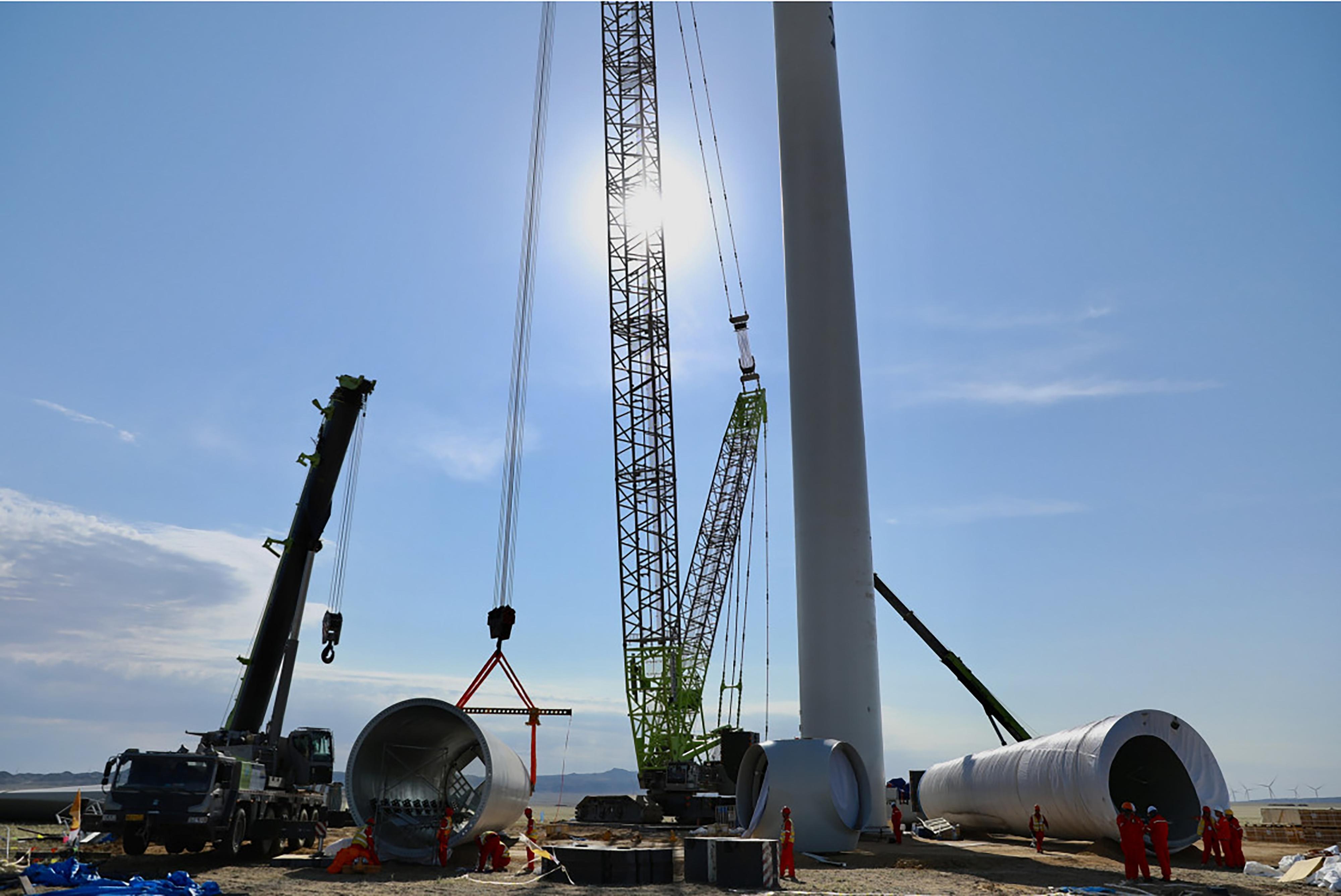 新疆油田阿勒泰吉木乃80萬千瓦風(fēng)電項(xiàng)目現(xiàn)場,技術(shù)人員正在做首臺(tái)風(fēng)機(jī)四段塔筒吊裝的準(zhǔn)備工作??死斠廊诿接浾?崔文娟 攝