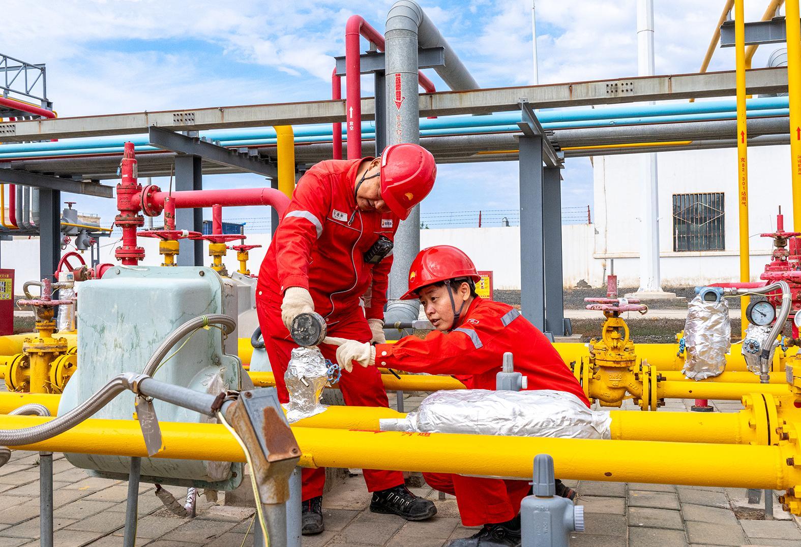 8月20日,在采氣一廠克75天然氣處理站,班長(zhǎng)付建新(左)與員工張軼在開(kāi)展日常巡檢,二人穿梭于黃色管道陣列,目光緊鎖設(shè)備細(xì)節(jié),為天然氣穩(wěn)產(chǎn)上產(chǎn)鑄牢安全基礎(chǔ)。