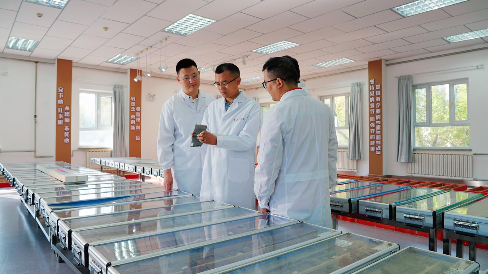 油田技術(shù)服務(wù)分公司科研人員觀察巖心資料,為后期油藏開發(fā)動用提供基礎(chǔ)依據(jù)。韓源遠(yuǎn) 攝