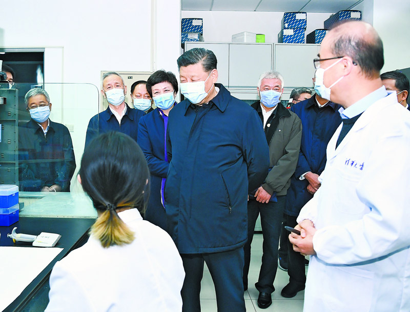 3月2日,中共中央總書記、國家主席、中央軍委主席習(xí)近平在北京考察新冠肺炎防控科研攻關(guān)工作。這是習(xí)近平在軍事醫(yī)學(xué)研究院重大疫情應(yīng)急防控藥物研究室了解疫苗和抗體研制情況。(據(jù)新華社)