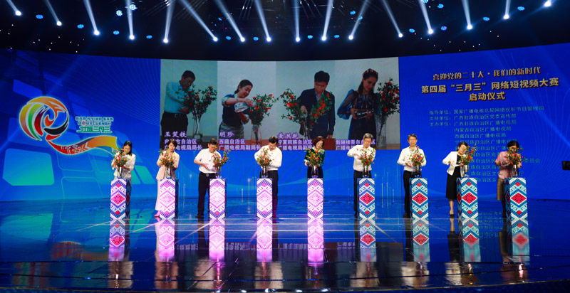 ????在啟動儀式上,廣西主會場嘉賓與內(nèi)蒙古、西藏、寧夏、新疆分會場嘉賓進行了網(wǎng)絡視頻連線,并同取家鄉(xiāng)水,共種石榴樹,寓意五十六個民族像石榴籽一樣緊密相擁,鑄牢中華民族共同體意識。來自五個少數(shù)民族自治區(qū)的“網(wǎng)紅”代表分別獻上了對大賽的祝福,呼吁網(wǎng)絡短視頻愛好者積極參賽,用視頻記錄和謳歌新時代。廣西全區(qū)14個地級市的文廣(體)旅局、廣播電視臺,以及各縣級融媒體中心和網(wǎng)絡視聽節(jié)目服務機構(gòu)代表通過線上方式參加了啟動儀式。