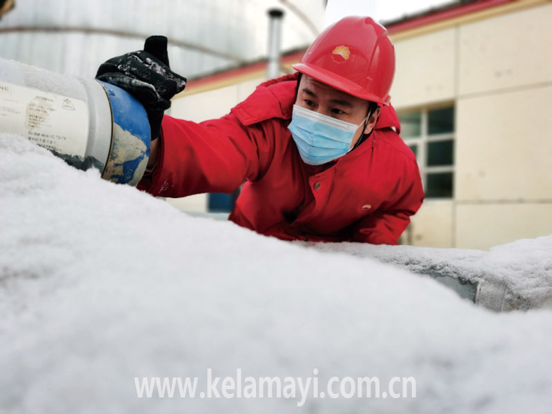本報(bào)通訊員 李想 攝 11月18日,百口泉采油廠瑪湖第三采油作業(yè)區(qū)員工正在清除保溫盒上的積雪。